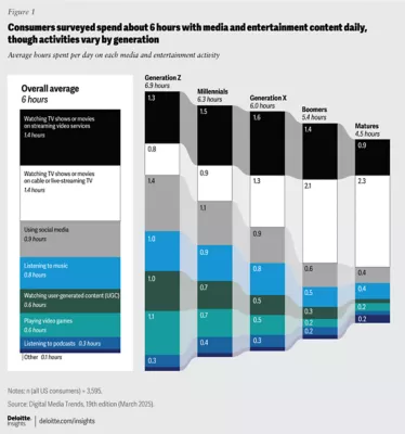 Media and entertainment companies may also be competing for a fixed amount of entertainment spending. We do not see those surveyed spending more money on subscriptions, and many report fatigue with having to manage multiple subscriptions to get the content they want, and frustrations with rising subscription prices. The median household annual income in the United States is about US$80,000 and is only now rebounding from COVID-19 pandemic declines that began in 2020.4 At the same time, consumer prices have climbed for most goods.5 In Deloitte’s January 2025 ConsumerSignals survey, about half of US households say they have no money left over at the end of the month after meeting their expenses.6 This can shift the household calculus to prioritize spending on essentials over discretionary entertainment. Twenty years ago, many households may have considered pay TV an essential cost. Since then, the number of digital entertainment options has grown significantly, but the amount of time and money available for it have not. This has enabled greater consumer choice, more competition, and more fragmentation.