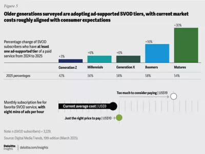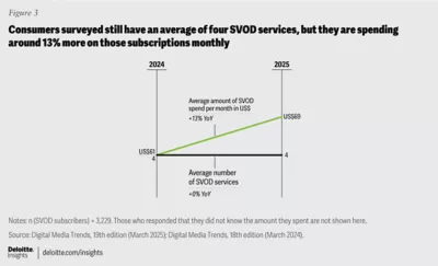 A similar tension seems to exist with streaming video services, which have subscription costs that may outweigh their perceived value. Fifty-three percent of consumers surveyed say their SVOD subscriptions are the paid media and entertainment services they use most frequently. However, 41% percent of consumers overall say the content available on SVOD isn’t worth the price, up five percentage points from our 2024 report.14 At the same time, roughly half (47%) of consumers say they pay too much for the streaming services they use, suggesting there is an imbalance between cost and perceived value. Indeed, while the average number of paid SVOD services has remained the same, at four per subscribing household, the overall cost subscribers surveyed say they pay has gone up 13% in the past year, from an average of $61 per month to $69. Gen Z and millennials, with an average of 5 paid SVOD services, have seen a 20% increase (figure 3).
