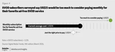 Currently, the average price for a premium, ad-free SVOD service subscription is around $16 per month, though the leading services can be significantly higher.15 However, according to Digital Media Trends data, consumers surveyed say that $14 is “just the right price” to pay for an ad-free subscription to their favorite SVOD service, with $25 being deemed too expensive (figure 4).