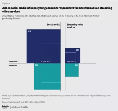 Once again, the technological advantage that social platforms have built becomes apparent. Gen Zs (63%), followed by millennials (49%), are much more likely to say that ads or product reviews on social media are most influential to their purchasing decisions. Ads on streaming video services are a distant second (28% and 25%, respectively) (figure 6). Additionally, 54% of these younger generations surveyed say that social media ads are more relevant to them than those on streaming video services or cable TV.