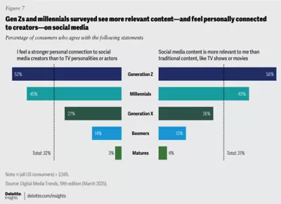 Given these trends, it may be unsurprising that 56% of Gen Zs and 43% of millennials surveyed report that social media content is more relevant to them than traditional content like TV shows and movies (figure 7). Gen Zs lead the trend: These respondents spend 54% more time—or about 50 minutes more—than the average consumer per day on social platforms and watching UGC; and 26% less time—or about 44 minutes less per day—than the average person watching TV and movies.