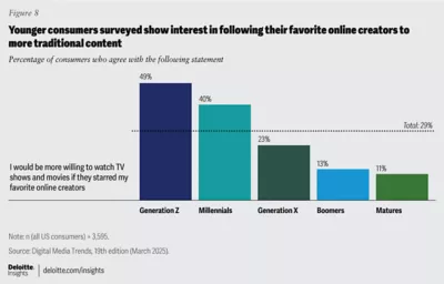 Despite (and sometimes because of) their success, some creators have made the leap to network television or major streaming video platforms—where they can secure lucrative and stable contracts, get more exposure, and grow their audiences. This approach is met with mixed reviews: Some consumers surveyed say they’d be more willing to watch TV shows or movies starring their favorite creators (29% of consumers overall), while others say that creators lose the authenticity they had on social media when they’re featured on TV shows (30% of consumers overall) (figure 8).