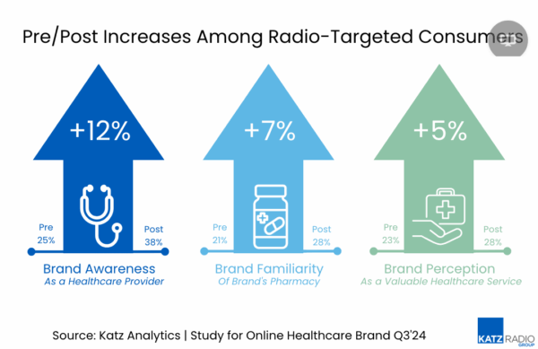 Healthcare goes beyond the doctor’s office, it’s about connection, convenience, and trust. One online healthcare brand ran a multimedia advertising campaign to build awareness for its Pharmacy and Healthcare services, with AM/FM radio playing a key role across eight major U.S. markets. Backed by Katz’s pre/post research, the campaign proved that radio isn’t just heard, it’s felt, driving real lifts in brand familiarity and positive perception.