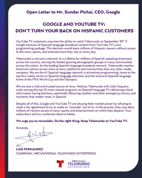 Luis Fernández, Chairman of NBCUniversal Telemundo, has written directly to Google’s CEO Sundar Pichai urging reconsideration and underscoring that Telemundo’s content is a vital connection and trusted resource for Latino viewers nationwide.