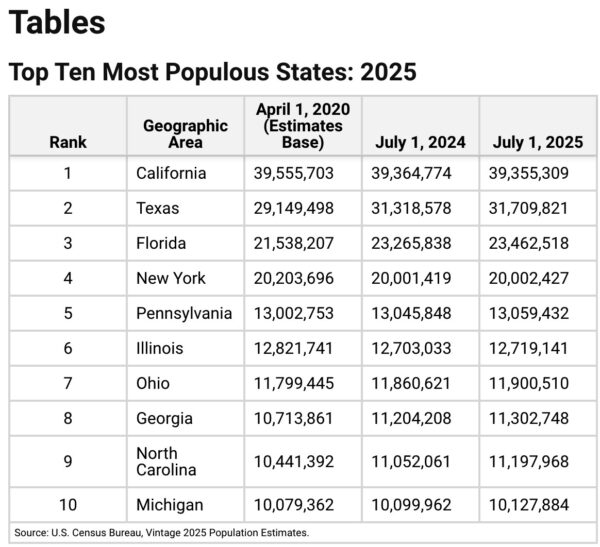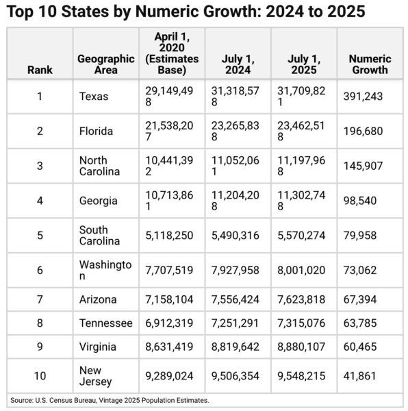 Refer to the bottom of the release for tables on the Top 10 Most Populous States: 2025Top 10 States by Numeric Growth: 2024 to 2025; and Top 10 States by Percent Growth: 2024 to 2025.