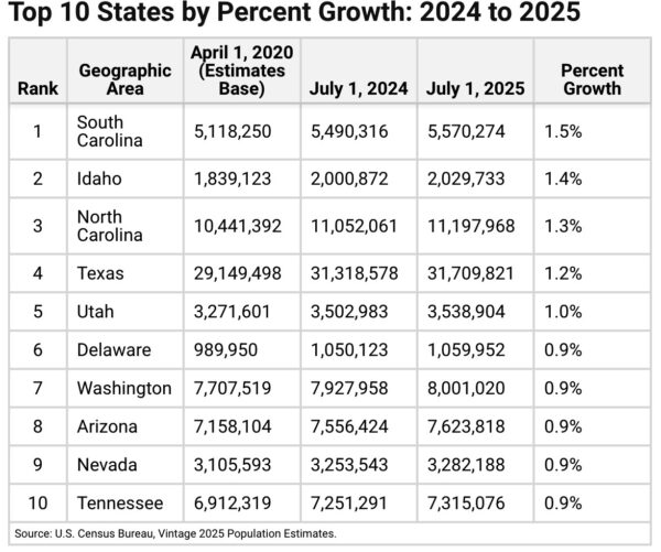 Fueled by a sizeable net domestic migration increase of 66,622, South Carolina’s population grew by 79,958 between July 1, 2024, and July 1, 2025. The increase of 1.5% was the highest of any state and was down somewhat from its 1.8% increase in 2024. Idaho (1.4%) and North Carolina (1.3%) followed closely, with their growth also driven by domestic migration gains. Texas (1.2%) grew rapidly from a combination of natural change and net international migration, despite a sharp slowdown in gains from the latter. Utah (1.0%) grew mainly from natural change, as net international migration — the largest contributor to its growth last year — slowed.