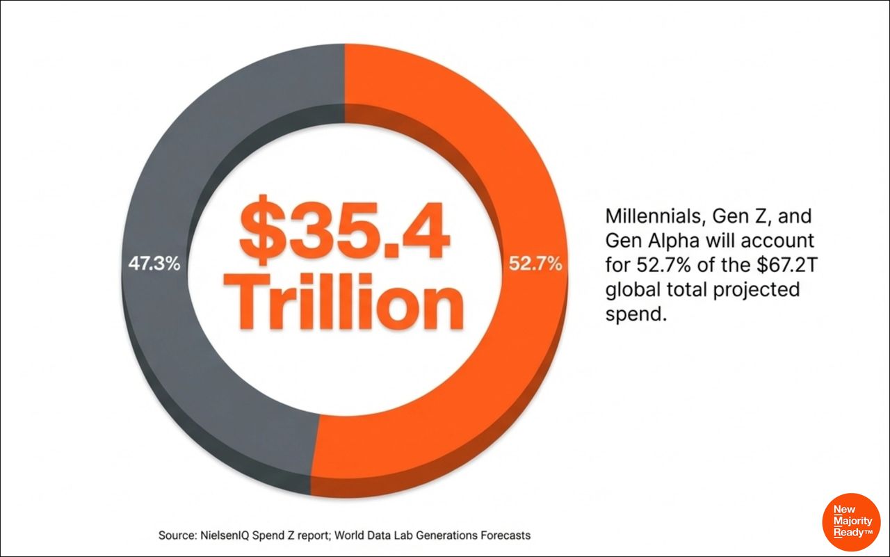 This demographic is rapidly taking command of consumer spending, building wealth at younger ages and doing it faster than any previous generation. By 2030, the New Majority is projected to account for $35.4 trillion in global spending, nearly 53% of the total. That makes this a business reality, not a demographic footnote.