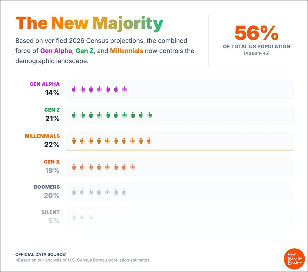 The New Majority is made up of the 192 million Americans under 45: Millennials, Gen Z, and Gen Alpha. They now represent 56% of the U.S. population and are the most diverse, digitally native, and soon-to-be, economically influential consumer bloc in the country. They are the “new general market.”